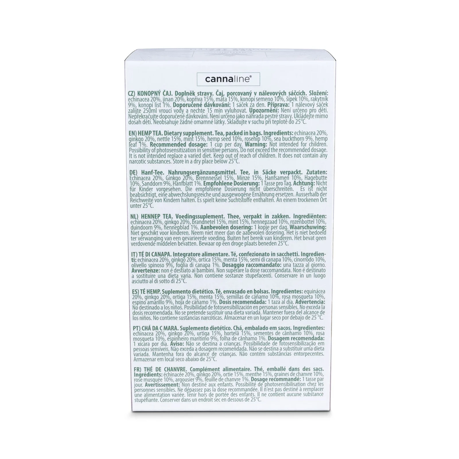 - Ingredientes: Equinácea 20%, ginkgo 20%, ortiga 15%, menta 15%, semilla de cáñamo 10%, rosa mosqueta 10%, espino amarillo 9%, hoja de cáñamo 1%. Vegano, sin colorantes ni aromas artificiales.