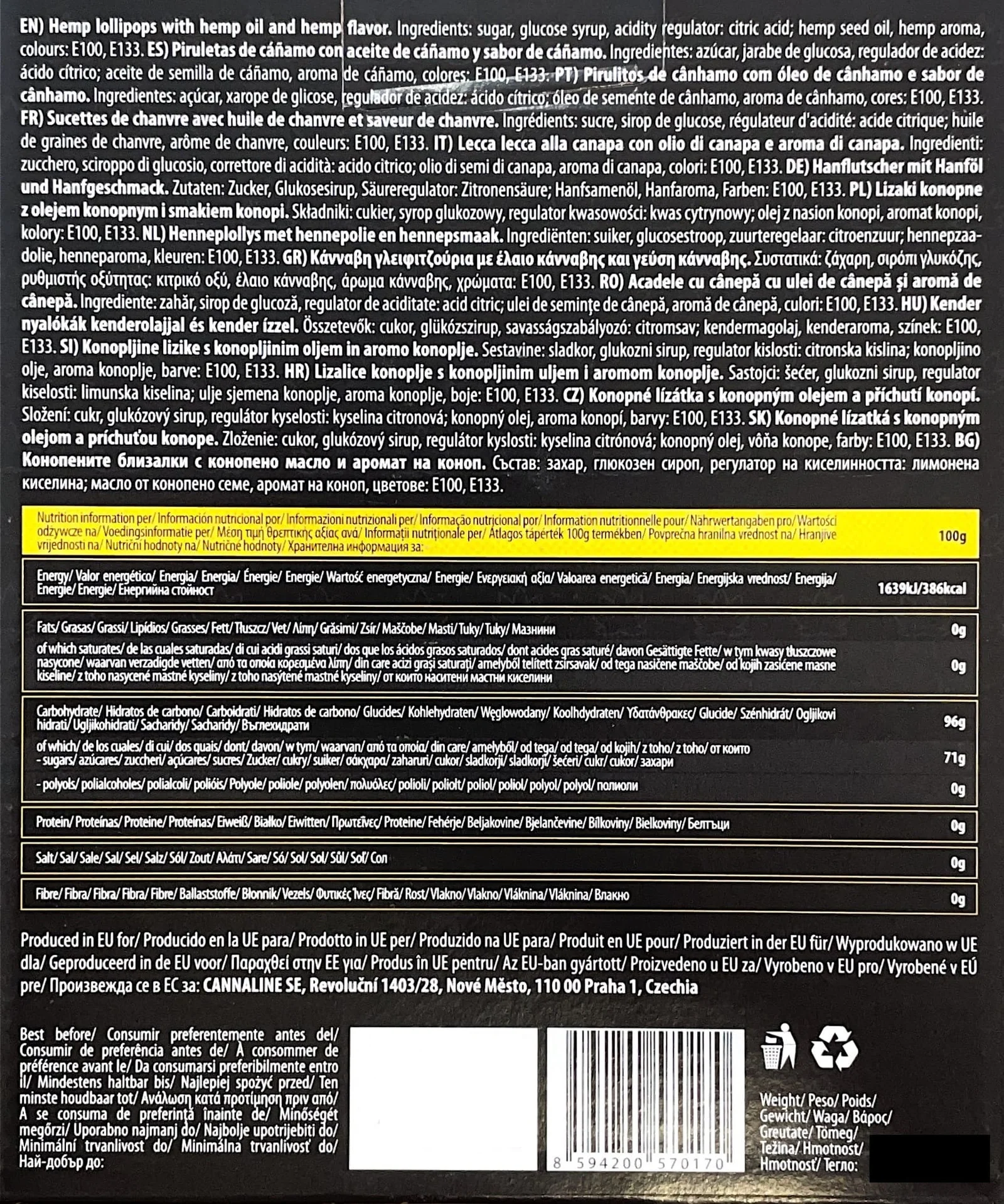 Ingredientes: Azúcar, jarabe de glucosa, regulador de la acidez: ácido cítrico; aceite de semillas de cáñamo, aroma de cáñamo, colorantes: E100, E133. Puede contener: leche, frutos secos, soja y gluten. Sin THC.