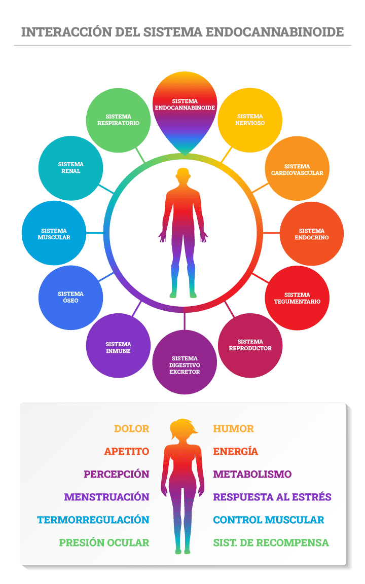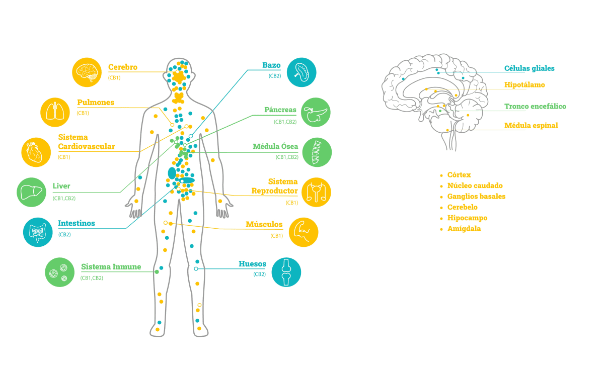La presencia de receptores CB-1 y CB-2 en la mayoría de los procesos implicados en la absorción de nutrientes, producción de energía, reproducción, excreción, locomoción, y protección inmunitaria de nuestro cuerpo explica la acción terapéutica de los cannabinoides sobre la regulación y el equilibrio energético.