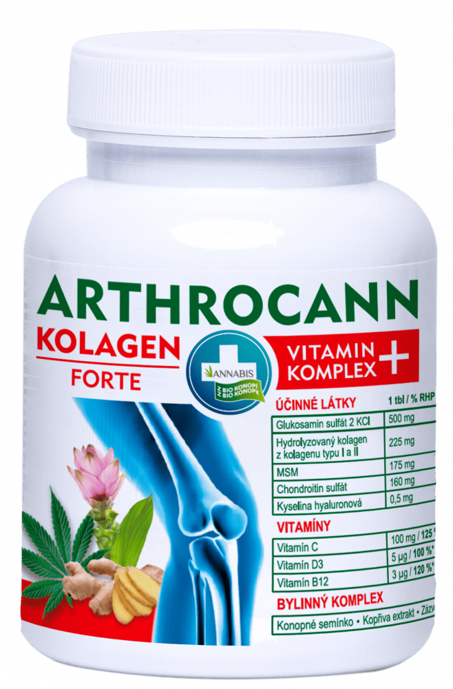 ARTHROCANN Colágeno Vitamin Complex+ es un complemento alimenticio a base de sulfato de glucosamina, condroitina, colágeno, MSM, ácido hialurónico, vitaminas, cáñamo y otras plantas. El colágeno es un componente estructural básico del cartílago articular. La vitamina C contribuye al funcionamiento normal del sistema inmunitario durante el ejercicio físico intenso y después de este, contribuye a la formación normal de colágeno para el funcionamiento normal de los huesos y cartílagos. También ayuda a disminuir el cansancio y la fatiga. La vitamina D contribuye a la absorción y utilización normal del calcio y el fósforo, al mantenimiento de niveles normales de calcio en sangre, al mantenimiento de los huesos en condiciones normales y contribuye al funcionamiento normal de los músculos.